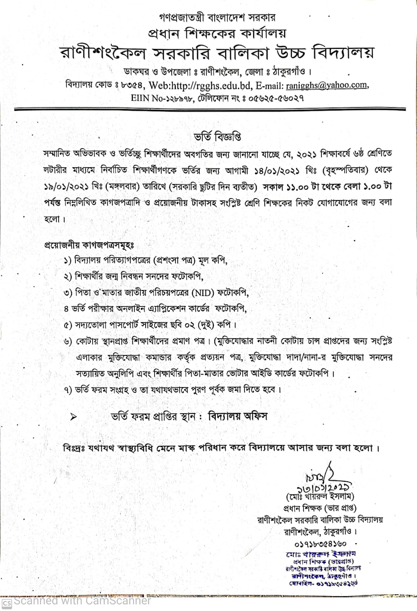 ২০২১ শিক্ষাবর্ষের ভর্তির নোটিশ